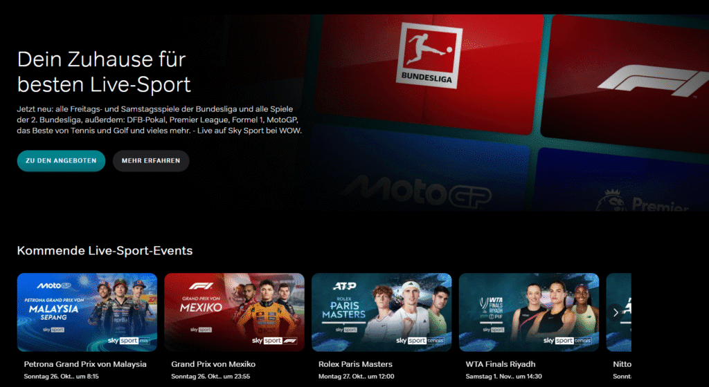 • WOW Live-Sport: Perfekt für alle, die keine Sekunde der Action verpassen wollen – von Bundesliga über Formel 1 bis hin zu Tennis und Golf.